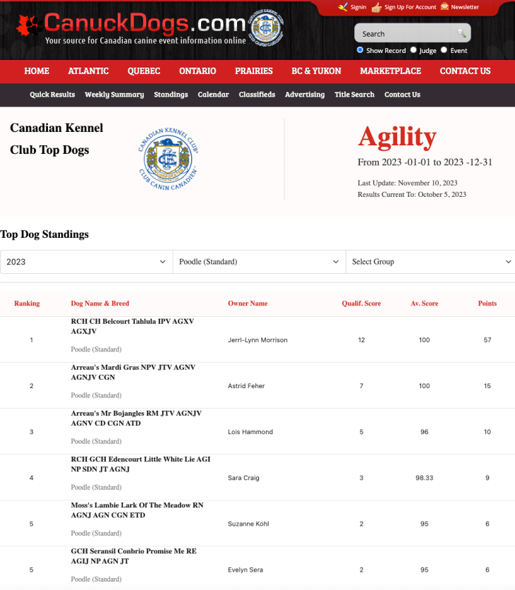 Arreau dogs ranked the #2 and #3 standard poodles in CKC agility for 2023!