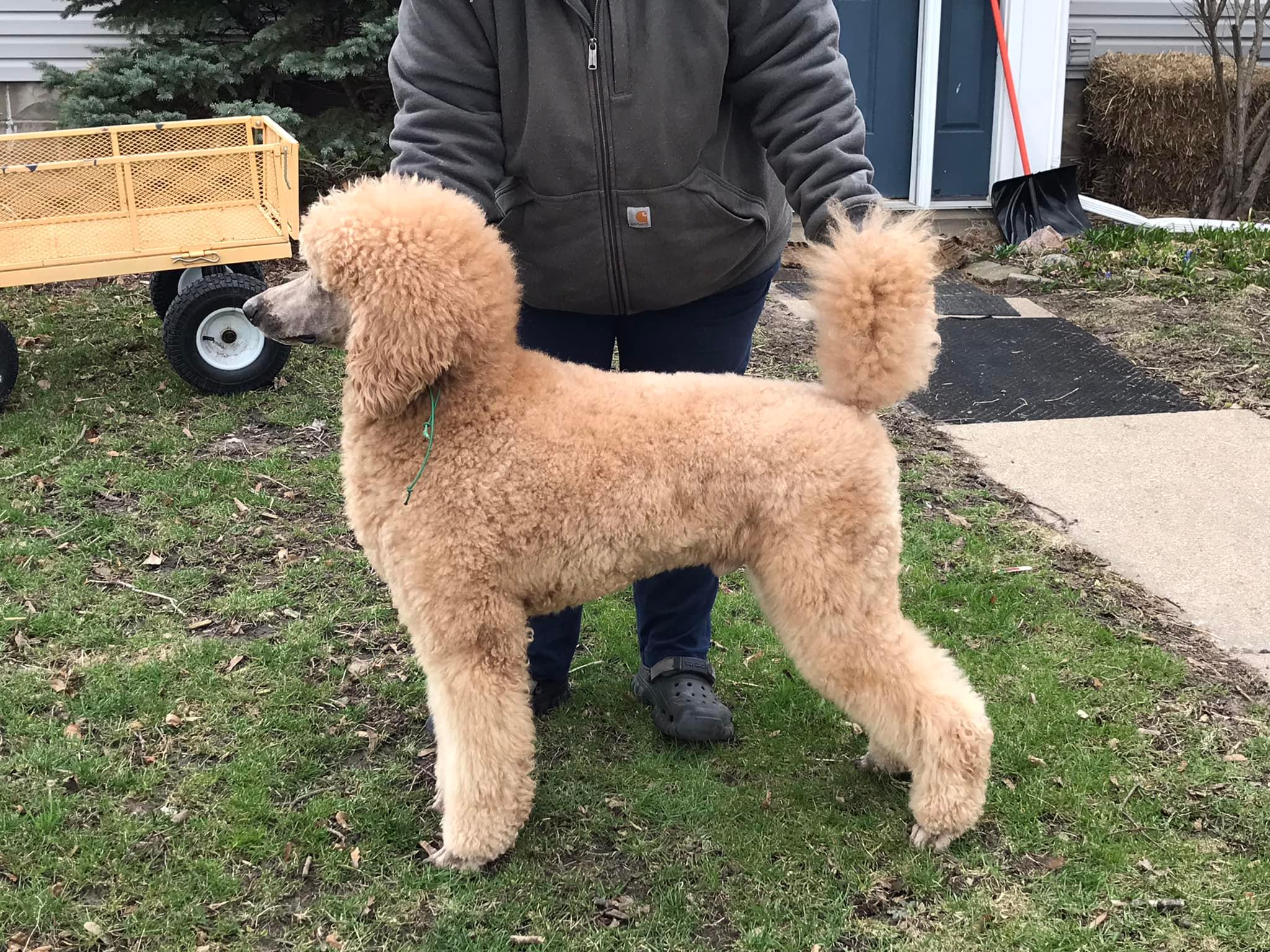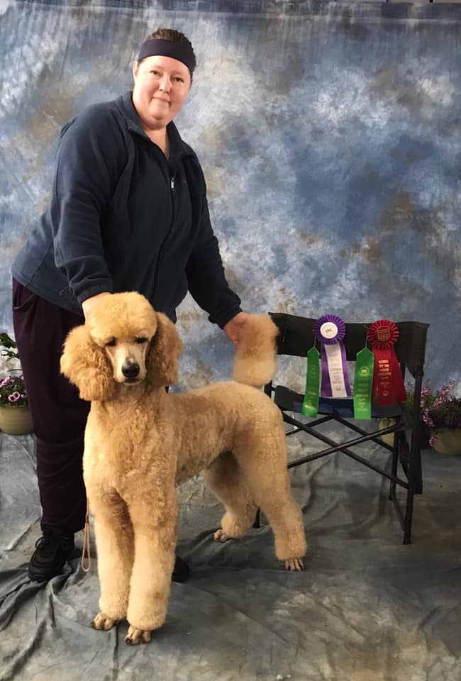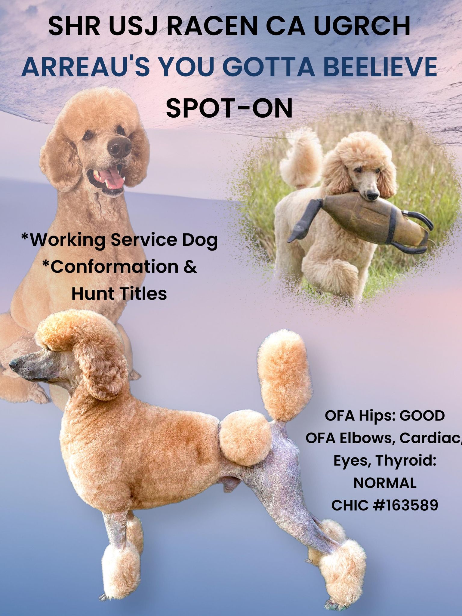 Rio has earned his UKC Grand Championship and SPOT ON (the UKC equivalent of a CGC) among other titles! He is starting his journey in the field, nose work, rally and dock diving. He is his other Mom’s service dog. Rio has a remarkable temperament, with drive, but a reliable “off switch”. Fully health tested – clear by parentage of vWd, NE and DM. He is available to approved girls.